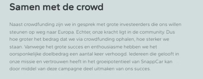 Het is een knappe prestatie om enerzijds groei doelen te bereiken, zonder problemen en anderzijds alle crowd investeringen grotendeels te laten verdampen en je ziel (Samen, sociaal, delen) aan één grote speler te verkopen!?. En misschien nog wel de meest rakende, een kernbelofte te breken “Iedereen die gelooft in Snappcar deel laten uitmaken van het succes!”